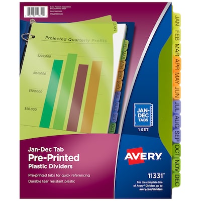 These Avery pre-printed monthly plastic dividers are pre-printed with each month of the year for easy identification of files. Each quarter features a different color, which makes it possible to keep financial reports, client orders, and other detailed information stored in the correct section.
