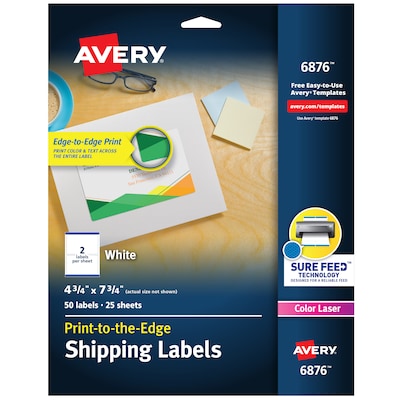 Avery Print-to-the-Edge Color Laser Shipping Labels, 4-3/4" x 7-3/4", White, 50 Labels/Pack (6876)