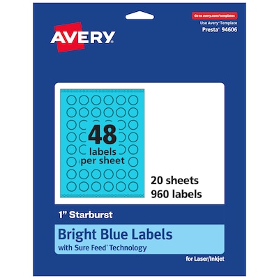 Design your own high-visibility labels with vibrant, bright colors with Avery Bright Blue Starburst 1" Labels. Created with brilliantly eye-catching bright blue label material, these vivid labels will immediately grab people's attention so that you can easily make your own decorative labels, pricing labels, mailing seals, planner stickers, and more! The bright color is perfect whether you need to create warnings, organize inventory, or make sure your product labels stand out on a shelf. Colored labels also help you reduce printing costs by printing with black ink instead of printing color ink on white paper. Compatible with both laser and inkjet printers, these labels make it easy to design professional labels with your own home or office printer. The print-to-the-edge layout allows you to create full-bleed artwork that allows the bright label color to peek through gaps in your design and it also lets you add in borders that fill the edges without any empty spaces. Easily customize stickers, product labels, packaging labels, and more with your own logos, art, symbols, and messaging by using the templates and designs in Avery Design & Print on the Avery site.