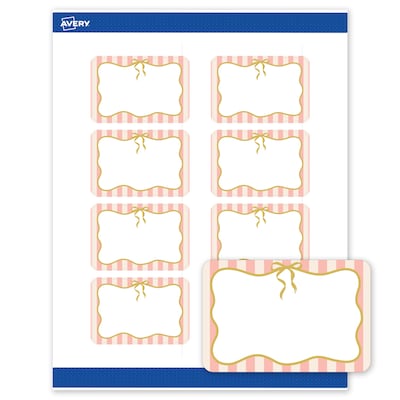 Add a touch of sophistication to branding, products, or events with Avery 2" x 3" Rectangle Labels featuring the Pink Stripes with Metallic Gold Bow design. Elevate your projects with these premium, printable Labels that feature a pre-printed border with elegant metallic gold accents, delivering a look no standard printer can match. With a design already preprinted, you can easily customize the blank space while using less ink. For a cohesive look, pair these event-ready labels with other Avery products in the same design collection. Featuring convenient Pop-Up Edge technology for faster peeling, these permanent customizable labels apply smoothly and stay securely in place. The smooth matte white finish delivers clean, versatile results that work beautifully across a wide range of projects. Built-in Sure Feed technology helps reduce misalignments and printer jams by creating a more reliable feed through your printer. Compatible with both laser and inkjet printers, you can easily print wedding stickers, wax melt labels, mailing labels, and more with professional results. Just use Avery Design & Print and search Avery Presta Template S00-FY9 to add your own logo, text, and artwork. Combining style and convenience, these Avery Labels help bring your ideas to life with coordinated, professional designs that elevate a wide range of projects and events.