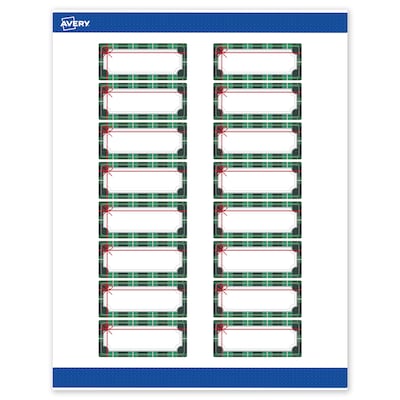 Add festive fun to branding and events with Avery(R) 1" x 2-5/8" Rectangle Holiday Labels featuring the Green Plaid Border with Silver Scalloped Frame and Red Bow design. Elevate your business or event with these premium, printable labels that feature a pre-printed border with elegant metallic accents, delivering a look no standard desktop printer can match. With a design already pre-printed, you can easily customize the blank space while using less ink—just personalize and print. For a cohesive look, pair these holiday labels with other Avery(R) products in the same design collection. Featuring convenient Pop-Up Edge technology for faster peeling, these permanent customizable labels apply smoothly and stay securely in place. The smooth matte white finish delivers clean, versatile results that work beautifully across a wide range of projects. Built-in Sure Feed(R) technology helps reduce misalignments and printer jams by creating a more reliable feed through your printer. Compatible with laser and inkjet printers, you can easily print holiday product labels, Christmas stickers, Christmas tag stickers, place card labels, Christmas labels, and more with professional results. Just use Avery(R) Design & Print and search Avery Presta(R) Template S00-FJ4 to add your own logo, text, and artwork for a personal touch.