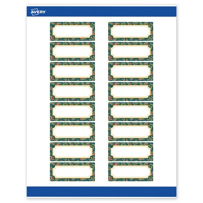 Add festive fun to branding and events with Avery(R) 1" x 2-5/8" Rectangle Holiday Labels featuring the Teal Border with Gold Scalloped Frame and Holly Berries design. Elevate your business or event with these premium, printable labels that feature a pre-printed border with elegant metallic accents, delivering a look no standard desktop printer can match. With a design already pre-printed, you can easily customize the blank space while using less ink—just personalize and print. For a cohesive look, pair these holiday labels with other Avery(R) products in the same design collection. Featuring convenient Pop-Up Edge technology for faster peeling, these permanent customizable labels apply smoothly and stay securely in place. The smooth matte white finish delivers clean, versatile results that work beautifully across a wide range of projects. Built-in Sure Feed(R) technology helps reduce misalignments and printer jams by creating a more reliable feed through your printer. Compatible with laser and inkjet printers, you can easily print holiday product labels, Christmas stickers, Christmas tag stickers, place card labels, Christmas labels, and more with professional results. Just use Avery(R) Design & Print and search Avery Presta(R) Template S00-FF0 to add your own logo, text, and artwork for a personal touch. Our easy-to-use design software lets you add your own personal touch while enjoying the consistency of the stunning, pre-printed design.