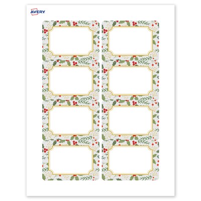 Add festive fun to branding and events with Avery(R) 2-1/3" x 3-3/8" Rectangle Holiday Name Badges featuring the Light Blue Border with Gold Scalloped Frame and Holly Berries design. Elevate your business or event with these premium, printable name badges that feature a pre-printed border with elegant metallic accents, delivering a look no standard desktop printer can match. With a design already pre-printed, you can easily customize the blank space while using less ink—just personalize and print. For a cohesive look, pair these holiday name badges with other Avery(R) products in the same design collection. Designed to stick firmly and remove cleanly without leaving behind residue, these customizable badges are also ideal for a variety of applications. The smooth matte white finish delivers clean, versatile results that work beautifully across a wide range of projects. Compatible with laser and inkjet printers, you can easily print holiday favor labels, Christmas labels, Christmas tag labels, and more with professional results. Just use Avery(R) Design & Print and search Avery Presta(R) Template S00-FED to add your own logo, text, and artwork for a personal touch. Our easy-to-use design software lets you add your own personal touch while enjoying the consistency of the stunning, pre-printed design.