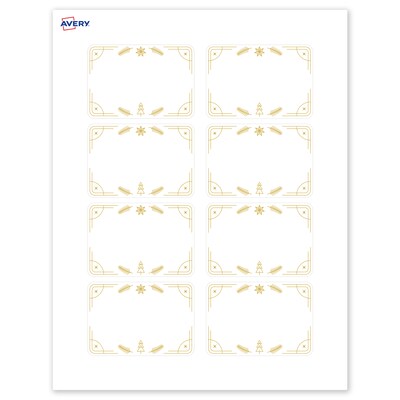 Add festive fun to branding and events with Avery(R) 2-1/3" x 3-3/8" Rectangle Holiday Name Badges featuring the White and Gold Christmas Trees design. Elevate your business or event with these premium, printable name badges that feature a pre-printed border with elegant metallic accents, delivering a look no standard desktop printer can match. With a design already pre-printed, you can easily customize the blank space while using less ink—just personalize and print. For a cohesive look, pair these holiday name badges with other Avery(R) products in the same design collection. Designed to stick firmly and remove cleanly without leaving behind residue, these customizable badges are also ideal for a variety of applications. The smooth matte white finish delivers clean, versatile results that work beautifully across a wide range of projects. Compatible with laser and inkjet printers, you can easily print holiday favor labels, Christmas labels, Christmas tag labels, and more with professional results. Just use Avery(R) Design & Print and search Avery Presta(R) Template S00-FDX to add your own logo, text, and artwork for a personal touch. Our easy-to-use online design software lets you easily add your own personal touch while enjoying the consistency and convenience of the stunning, pre-printed festive design.