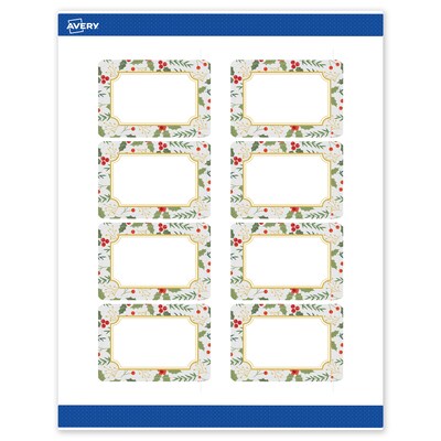 Add festive fun to branding and events with Avery(R) 2" x 3" Rectangle Holiday Labels featuring the Light Blue Border with Gold Scalloped Frame and Holly Berries design. Elevate your business or event with these premium, printable labels that feature a pre-printed border with elegant metallic accents, delivering a look no standard desktop printer can match. With a design already pre-printed, you can easily customize the blank space while using less ink—just personalize and print. For a cohesive look, pair these holiday labels with other Avery(R) products in the same design collection. Featuring convenient Pop-Up Edge technology for faster peeling, these permanent customizable labels apply smoothly and stay securely in place. The smooth matte white finish delivers clean, versatile results that work beautifully across a wide range of projects. Built-in Sure Feed(R) technology helps reduce misalignments and printer jams by creating a more reliable feed through your printer. Compatible with laser and inkjet printers, you can easily print food & beverage labels, labels for wax melts, bath & beauty labels, and more with professional results. Just use Avery(R) Design & Print and search Avery Presta(R) Template S00-FEH to add your own logo, text, and artwork for a personal touch. Our easy-to-use design software lets you add your own personal touch while enjoying the consistency of the stunning, pre-printed design.