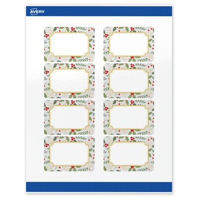Add festive fun to branding and events with Avery(R) 2" x 3" Rectangle Holiday Labels featuring the Light Blue Border with Gold Scalloped Frame and Holly Berries design. Elevate your business or event with these premium, printable labels that feature a pre-printed border with elegant metallic accents, delivering a look no standard desktop printer can match. With a design already pre-printed, you can easily customize the blank space while using less ink—just personalize and print. For a cohesive look, pair these holiday labels with other Avery(R) products in the same design collection. Featuring convenient Pop-Up Edge technology for faster peeling, these permanent customizable labels apply smoothly and stay securely in place. The glossy white finish reflects light for vivid color and detail, creating a premium, polished appearance. Built-in Sure Feed(R) technology helps reduce misalignments and printer jams by creating a more reliable feed through your printer. Compatible with laser and inkjet printers, you can easily print food & beverage labels, labels for wax melts, bath & beauty labels, and more with professional results. Just use Avery(R) Design & Print and search Avery Presta(R) Template S00-FEH to add your own logo, text, and artwork for a personal touch. Our easy-to-use design software lets you add your own personal touch while enjoying the consistency of the stunning, pre-printed design.