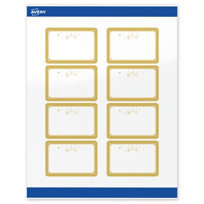 Add festive fun to branding and events with Avery(R) 2" x 3" Rectangle Holiday Labels featuring the Metallic Gold Scalloped Border with Hanging Ornaments design. Elevate your business or event with these premium, printable labels that feature a pre-printed border with elegant metallic accents, delivering a look no standard desktop printer can match. With a design already pre-printed, you can easily customize the blank space while using less ink—just personalize and print. For a cohesive look, pair these holiday labels with other Avery(R) products in the same design collection. Featuring convenient Pop-Up Edge technology for faster peeling, these permanent customizable labels apply smoothly and stay securely in place. The glossy white finish reflects light for vivid color and detail, creating a premium, polished appearance. Built-in Sure Feed(R) technology helps reduce misalignments and printer jams by creating a more reliable feed through your printer. Compatible with laser and inkjet printers, you can easily print food & beverage labels, labels for wax melts, bath & beauty labels, and more with professional results. Just use Avery(R) Design & Print and search Avery Presta(R) Template S00-FH2 to add your own logo, text, and artwork for a personal touch. Our easy-to-use design software lets you add your own personal touch while enjoying the consistency of the stunning, pre-printed design.