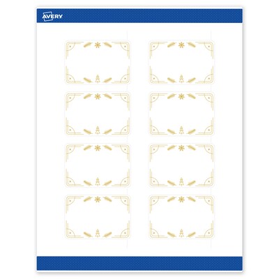 Add festive fun to branding and events with Avery(R) 2" x 3" Rectangle Holiday Labels featuring the White and Gold Christmas Trees design. Elevate your business or event with these premium, printable labels that feature a pre-printed border with elegant metallic accents, delivering a look no standard desktop printer can match. With a design already pre-printed, you can easily customize the blank space while using less ink—just personalize and print. For a cohesive look, pair these holiday labels with other Avery(R) products in the same design collection. Featuring convenient Pop-Up Edge technology for faster peeling, these permanent customizable labels apply smoothly and stay securely in place. The smooth matte white finish delivers clean, versatile results that work beautifully across a wide range of projects. Built-in Sure Feed(R) technology helps reduce misalignments and printer jams by creating a more reliable feed through your printer. Compatible with laser and inkjet printers, you can easily print food & beverage labels, labels for wax melts, bath & beauty labels, and more with professional results. Just use Avery(R) Design & Print and search Avery Presta(R) Template S00-FE6 to add your own logo, text, and artwork for a personal touch. Our easy-to-use design software lets you add your own personal touch while enjoying the consistency of the stunning, pre-printed design.