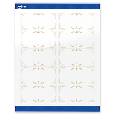 Add festive fun to branding and events with Avery(R) 2" x 4" Rectangle Holiday Labels featuring the White and Gold Christmas Trees design. Elevate your business or event with these premium, printable labels that feature a pre-printed border with elegant metallic accents, delivering a look no standard desktop printer can match. With a design already pre-printed, you can easily customize the blank space while using less ink—just personalize and print. For a cohesive look, pair these holiday labels with other Avery(R) products in the same design collection. Backed by permanent adhesive, these festive labels are designed to apply smoothly, hold securely in place, and maintain a professional look throughout the season. The glossy white finish reflects light for vivid color and detail, creating a premium, polished appearance. Built-in Sure Feed(R) technology helps reduce misalignments and printer jams by creating a more reliable feed through your printer. Compatible with laser and inkjet printers, you can easily print candle labels, food & beverage labels, labels for wax melts, bath & beauty labels, Christmas tag stickers, and more with professional results. Just use Avery(R) Design & Print and search Avery Presta(R) Template S00-FDV to add your own logo, text, and artwork for a personal touch.