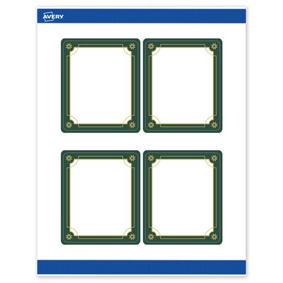 Add festive fun to branding and events with Avery(R) 4" x 3-1/3" Rectangle Holiday Labels featuring the Green Border with Gold Scalloped Frame design. Elevate your business or event with these premium, printable labels that feature a pre-printed border with elegant metallic accents, delivering a look no standard desktop printer can match. With a design already pre-printed, you can easily customize the blank space while using less ink—just personalize and print. For a cohesive look, pair these holiday labels with other Avery(R) products in the same design collection. Featuring convenient Pop-Up Edge technology for faster peeling, these permanent customizable labels apply smoothly and stay securely in place. The smooth matte white finish delivers clean, versatile results that work beautifully across a wide range of projects. Built-in Sure Feed(R) technology helps reduce misalignments and printer jams by creating a more reliable feed through your printer. Compatible with laser and inkjet printers, you can easily print candle labels, food & beverage labels, skincare labels, Christmas tag stickers, and more with professional results. Just use Avery(R) Design & Print and search Avery Presta(R) Template S00-FDR to add your own logo, text, and artwork for a personal touch. Our easy-to-use design software lets you add your own personal touch while enjoying the consistency of the stunning, pre-printed design.