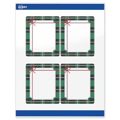 Add festive fun to branding and events with Avery(R) 4" x 3-1/3" Rectangle Holiday Labels featuring the Green Plaid Border with Silver Scalloped Frame and Red Bow design. Elevate your business or event with these premium, printable labels that feature a pre-printed border with elegant metallic accents, delivering a look no standard desktop printer can match. With a design already pre-printed, you can easily customize the blank space while using less ink—just personalize and print. For a cohesive look, pair these holiday labels with other Avery(R) products in the same design collection. Featuring convenient Pop-Up Edge technology for faster peeling, these permanent customizable labels apply smoothly and stay securely in place. The glossy white finish reflects light for vivid color and detail, creating a premium, polished appearance. Built-in Sure Feed(R) technology helps reduce misalignments and printer jams by creating a more reliable feed through your printer. Compatible with laser and inkjet printers, you can easily print candle labels, food & beverage labels, skincare labels, Christmas tag stickers, and more with professional results. Just use Avery(R) Design & Print and search Avery Presta(R) Template S00-FJ6 to add your own logo, text, and artwork for a personal touch. Our easy-to-use design software lets you add your own personal touch while enjoying the consistency of the stunning, pre-printed design.