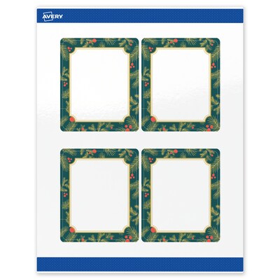 Add festive fun to branding and events with Avery(R) 4" x 3-1/3" Rectangle Holiday Labels featuring the Teal Border with Gold Scalloped Frame and Holly Berries design. Elevate your business or event with these premium, printable labels that feature a pre-printed border with elegant metallic accents, delivering a look no standard desktop printer can match. With a design already pre-printed, you can easily customize the blank space while using less ink—just personalize and print. For a cohesive look, pair these holiday labels with other Avery(R) products in the same design collection. Featuring convenient Pop-Up Edge technology for faster peeling, these permanent customizable labels apply smoothly and stay securely in place. The glossy white finish reflects light for vivid color and detail, creating a premium, polished appearance. Built-in Sure Feed(R) technology helps reduce misalignments and printer jams by creating a more reliable feed through your printer. Compatible with laser and inkjet printers, you can easily print candle labels, food & beverage labels, skincare labels, Christmas tag stickers, and more with professional results. Just use Avery(R) Design & Print and search Avery Presta(R) Template S00-FEY to add your own logo, text, and artwork for a personal touch. Our easy-to-use design software lets you add your own personal touch while enjoying the consistency of the stunning, pre-printed design.