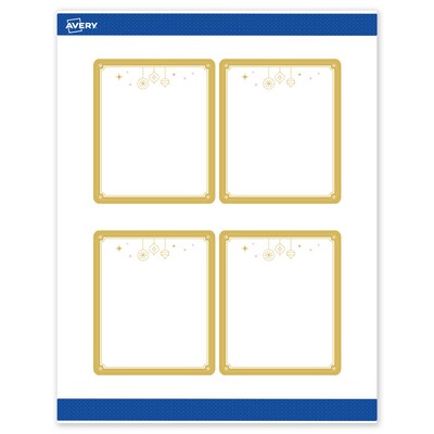 Add festive fun to branding and events with Avery(R) 4" x 3-1/3" Rectangle Holiday Labels featuring the Metallic Gold Scalloped Border with Hanging Ornaments design. Elevate your business or event with these premium, printable labels that feature a pre-printed border with elegant metallic accents, delivering a look no standard desktop printer can match. With a design already pre-printed, you can easily customize the blank space while using less ink—just personalize and print. For a cohesive look, pair these holiday labels with other Avery(R) products in the same design collection. Featuring convenient Pop-Up Edge technology for faster peeling, these permanent customizable labels apply smoothly and stay securely in place. The smooth matte white finish delivers clean, versatile results that work beautifully across a wide range of projects. Built-in Sure Feed(R) technology helps reduce misalignments and printer jams by creating a more reliable feed through your printer. Compatible with laser and inkjet printers, you can easily print candle labels, food & beverage labels, skincare labels, Christmas tag stickers, and more with professional results. Just use Avery(R) Design & Print and search Avery Presta(R) Template S00-FH9 to add your own logo, text, and artwork for a personal touch. Our easy-to-use design software lets you add your own personal touch while enjoying the consistency of the stunning, pre-printed design.