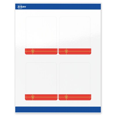 Add festive fun to branding and events with Avery(R) 4" x 3-1/3" Rectangle Holiday Labels featuring the Red Gift with Metallic Gold Bow design. Elevate your business or event with these premium, printable labels that feature a pre-printed border with elegant metallic accents, delivering a look no standard desktop printer can match. With a design already pre-printed, you can easily customize the blank space while using less ink—just personalize and print. For a cohesive look, pair these holiday labels with other Avery(R) products in the same design collection. Featuring convenient Pop-Up Edge technology for faster peeling, these permanent customizable labels apply smoothly and stay securely in place. The glossy white finish reflects light for vivid color and detail, creating a premium, polished appearance. Built-in Sure Feed(R) technology helps reduce misalignments and printer jams by creating a more reliable feed through your printer. Compatible with laser and inkjet printers, you can easily print candle labels, food & beverage labels, skincare labels, Christmas tag stickers, and more with professional results. Just use Avery(R) Design & Print and search Avery Presta(R) Template S00-FG1 to add your own logo, text, and artwork for a personal touch. Our easy-to-use design software lets you add your own personal touch while enjoying the consistency of the stunning, pre-printed design.