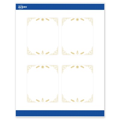 Add festive fun to branding and events with Avery(R) 4" x 3-1/3" Rectangle Holiday Labels featuring the White and Gold Christmas Trees design. Elevate your business or event with these premium, printable labels that feature a pre-printed border with elegant metallic accents, delivering a look no standard desktop printer can match. With a design already pre-printed, you can easily customize the blank space while using less ink—just personalize and print. For a cohesive look, pair these holiday labels with other Avery(R) products in the same design collection. Featuring convenient Pop-Up Edge technology for faster peeling, these permanent customizable labels apply smoothly and stay securely in place. The smooth matte white finish delivers clean, versatile results that work beautifully across a wide range of projects. Built-in Sure Feed(R) technology helps reduce misalignments and printer jams by creating a more reliable feed through your printer. Compatible with laser and inkjet printers, you can easily print candle labels, food & beverage labels, skincare labels, Christmas tag stickers, and more with professional results. Just use Avery(R) Design & Print and search Avery Presta(R) Template S00-FDZ to add your own logo, text, and artwork for a personal touch. Our easy-to-use design software lets you add your own personal touch while enjoying the consistency of the stunning, pre-printed design.