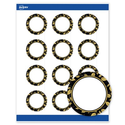Add a touch of sophistication to branding, products, or events with Avery 2" Diameter Round Labels featuring the Arched Black Border with Golden Leaves design. Elevate your projects with these premium, printable Labels that feature a pre-printed border with elegant metallic gold accents, delivering a look no standard printer can match. With a design already preprinted, you can easily customize the blank space while using less ink. For a cohesive look, pair these event-ready labels with other Avery products in the same design collection. Featuring convenient Pop-Up Edge technology for faster peeling, these permanent customizable labels apply smoothly and stay securely in place. The smooth matte white finish delivers clean, versatile results that work beautifully across a wide range of projects. Built-in Sure Feed technology helps reduce misalignments and printer jams by creating a more reliable feed through your printer. Compatible with both laser and inkjet printers, you can easily print wedding stickers, wedding favor labels, cosmetic labels, mailing seals, and more with professional results. Just use Avery Design & Print and search Avery Presta Template S00-G02 to add your own logo, text, and artwork. Combining style and convenience, these Avery Labels help bring your ideas to life with coordinated, professional designs that elevate a wide range of projects and events.