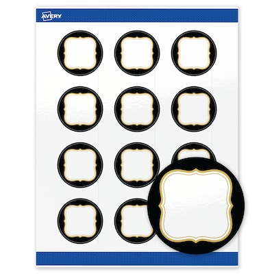 Add a touch of sophistication to branding, products, or events with Avery 2" Diameter Round Labels featuring the Black Border with Metallic Gold Flourish design. Elevate your projects with these premium, printable Labels that feature a pre-printed border with elegant metallic gold accents, delivering a look no standard printer can match. With a design already preprinted, you can easily customize the blank space while using less ink. For a cohesive look, pair these event-ready labels with other Avery products in the same design collection. Featuring convenient Pop-Up Edge technology for faster peeling, these permanent customizable labels apply smoothly and stay securely in place. The glossy white finish reflects light for vivid color and detail, creating a premium, polished appearance. Built-in Sure Feed technology helps reduce misalignments and printer jams by creating a more reliable feed through your printer. Compatible with both laser and inkjet printers, you can easily print wedding stickers, wedding favor labels, cosmetic labels, mailing seals, and more with professional results. Just use Avery Design & Print and search Avery Presta Template S00-FZH to add your own logo, text, and artwork. Combining style and convenience, these Avery Labels help bring your ideas to life with coordinated, professional designs that elevate a wide range of projects and events.