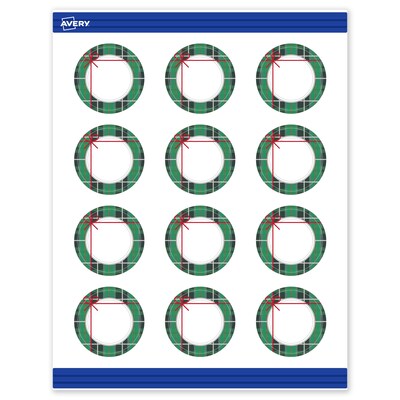 Add festive fun to branding and events with Avery(R) 2" Diameter Round Holiday Round Cards featuring the Green Plaid Border with Silver Scalloped Frame and Red Bow design. Elevate your business or event with these premium, printable round cards that feature a pre-printed border with elegant metallic accents, delivering a look no standard desktop printer can match. With a design already pre-printed, you can easily customize the blank space while using less ink—just personalize and print. For a cohesive look, pair these holiday round cards with other Avery(R) products in the same design collection. Made with sturdy 80 lbs / 216 gsm cardstock and micro-perforated edges, these customizable cards feature a pre-printed design on one side and can be personalized on both sides for full customization. The smooth matte white finish delivers clean, versatile results that work beautifully across a wide range of projects. Sure Feed(R) technology helps reduce misalignments and printer jams by creating a more reliable feed through your printer. Compatible with laser and inkjet printers, you can easily print wedding favor cards, table number cards, Christmas business cards, and more with professional results. Just use Avery(R) Design & Print and search Avery Presta(R) Template S00-FJ8 to add your own logo, text, and artwork for a personal touch.