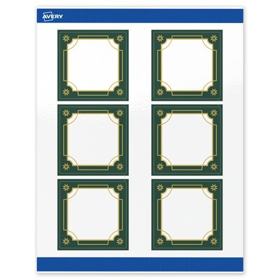 Add festive fun to branding and events with Avery(R) 3" x 3" Square Holiday Labels featuring the Green Border with Gold Scalloped Frame design. Elevate your business or event with these premium, printable labels that feature a pre-printed border with elegant metallic accents, delivering a look no standard desktop printer can match. With a design already pre-printed, you can easily customize the blank space while using less ink—just personalize and print. For a cohesive look, pair these holiday labels with other Avery(R) products in the same design collection. Featuring convenient Pop-Up Edge technology for faster peeling, these permanent customizable labels apply smoothly and stay securely in place. The glossy white finish reflects light for vivid color and detail, creating a premium, polished appearance. Built-in Sure Feed(R) technology helps reduce misalignments and printer jams by creating a more reliable feed through your printer. Compatible with laser and inkjet printers, you can easily print holiday product labels, Christmas tag stickers, holiday gift stickers, and more with professional results. Just use Avery(R) Design & Print and search Avery Presta(R) Template S00-FDH to add your own logo, text, and artwork for a personal touch. Our easy-to-use design software lets you add your own personal touch while enjoying the consistency of the stunning, pre-printed design.