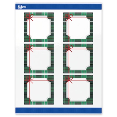 Create a lasting impression with easily customizable Avery(R) Labels that feature a stunning, pre-printed design. Add festive fun to branding and events with Avery(R) 3" x 3" Square Holiday Labels featuring the Green Plaid Border with Silver Scalloped Frame and Red Bow design. Elevate your business or event with these premium, printable labels that feature a pre-printed border with elegant metallic accents, delivering a look no standard desktop printer can match. With a design already pre-printed, you can easily customize the blank space while using less ink—just personalize and print. For a cohesive look, pair these holiday labels with other Avery(R) products in the same design collection. Featuring convenient Pop-Up Edge technology for faster peeling, these permanent customizable labels apply smoothly and stay securely in place. The glossy white finish reflects light for vivid color and detail, creating a premium, polished appearance. Built-in Sure Feed(R) technology helps reduce misalignments and printer jams by creating a more reliable feed through your printer. Compatible with laser and inkjet printers, you can easily print holiday product labels, Christmas tag stickers, holiday gift stickers, and more with professional results. Just use Avery(R) Design & Print and search Avery Presta(R) Template S00-FJE to add your own logo, text, and artwork for a personal touch. Our easy-to-use design software lets you add your own personal touch while enjoying the consistency of the stunning, pre-printed design.