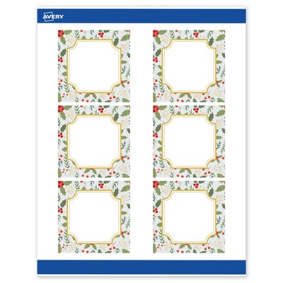 Add festive fun to branding and events with Avery(R) 3" x 3" Square Holiday Labels featuring the Light Blue Border with Gold Scalloped Frame and Holly Berries design. Elevate your business or event with these premium, printable labels that feature a pre-printed border with elegant metallic accents, delivering a look no standard desktop printer can match. With a design already pre-printed, you can easily customize the blank space while using less ink—just personalize and print. For a cohesive look, pair these holiday labels with other Avery(R) products in the same design collection. Featuring convenient Pop-Up Edge technology for faster peeling, these permanent customizable labels apply smoothly and stay securely in place. The smooth matte white finish delivers clean, versatile results that work beautifully across a wide range of projects. Built-in Sure Feed(R) technology helps reduce misalignments and printer jams by creating a more reliable feed through your printer. Compatible with laser and inkjet printers, you can easily print holiday product labels, Christmas tag stickers, holiday gift stickers, and more with professional results. Just use Avery(R) Design & Print and search Avery Presta(R) Template S00-FEE to add your own logo, text, and artwork for a personal touch. Our easy-to-use design software lets you add your own personal touch while enjoying the consistency of the stunning, pre-printed design.