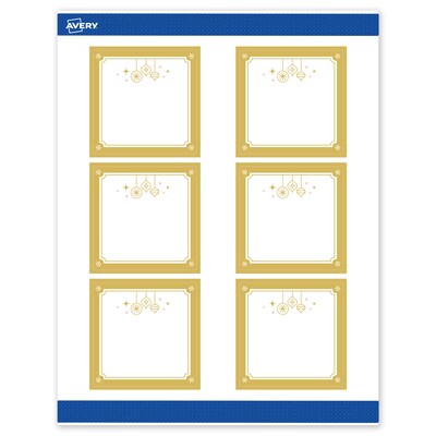 Add festive fun to branding and events with Avery(R) 3" x 3" Square Holiday Labels featuring the Metallic Gold Scalloped Border with Hanging Ornaments design. Elevate your business or event with these premium, printable labels that feature a pre-printed border with elegant metallic accents, delivering a look no standard desktop printer can match. With a design already pre-printed, you can easily customize the blank space while using less ink—just personalize and print. For a cohesive look, pair these holiday labels with other Avery(R) products in the same design collection. Featuring convenient Pop-Up Edge technology for faster peeling, these permanent customizable labels apply smoothly and stay securely in place. The smooth matte white finish delivers clean, versatile results that work beautifully across a wide range of projects. Built-in Sure Feed(R) technology helps reduce misalignments and printer jams by creating a more reliable feed through your printer. Compatible with laser and inkjet printers, you can easily print holiday product labels, Christmas tag stickers, holiday gift stickers, and more with professional results. Just use Avery(R) Design & Print and search Avery Presta(R) Template S00-FH4 to add your own logo, text, and artwork for a personal touch. Our easy-to-use design software lets you add your own personal touch while enjoying the consistency of the stunning, pre-printed design.