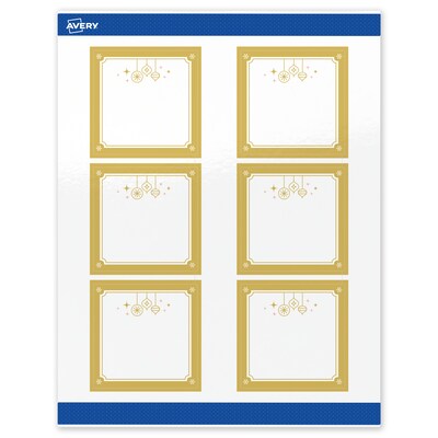 Add festive fun to branding and events with Avery(R) 3" x 3" Square Holiday Labels featuring the Metallic Gold Scalloped Border with Hanging Ornaments design. Elevate your business or event with these premium, printable labels that feature a pre-printed border with elegant metallic accents, delivering a look no standard desktop printer can match. With a design already pre-printed, you can easily customize the blank space while using less ink—just personalize and print. For a cohesive look, pair these holiday labels with other Avery(R) products in the same design collection. Featuring convenient Pop-Up Edge technology for faster peeling, these permanent customizable labels apply smoothly and stay securely in place. The glossy white finish reflects light for vivid color and detail, creating a premium, polished appearance. Built-in Sure Feed(R) technology helps reduce misalignments and printer jams by creating a more reliable feed through your printer. Compatible with laser and inkjet printers, you can easily print holiday product labels, Christmas tag stickers, holiday gift stickers, and more with professional results. Just use Avery(R) Design & Print and search Avery Presta(R) Template S00-FH4 to add your own logo, text, and artwork for a personal touch. Our easy-to-use design software lets you add your own personal touch while enjoying the consistency of the stunning, pre-printed design.