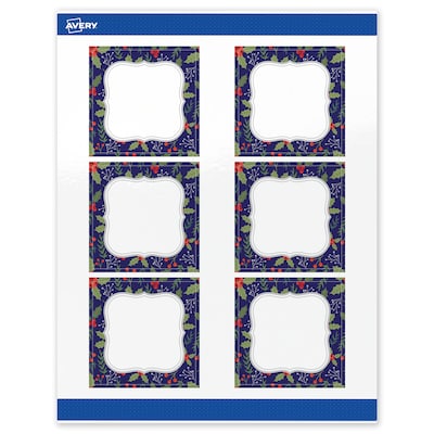 Add festive fun to branding and events with Avery(R) 3" x 3" Square Holiday Labels featuring the Navy Blue Border with Silver Flourished Frame design. Elevate your business or event with these premium, printable labels that feature a pre-printed border with elegant metallic accents, delivering a look no standard desktop printer can match. With a design already pre-printed, you can easily customize the blank space while using less ink—just personalize and print. For a cohesive look, pair these holiday labels with other Avery(R) products in the same design collection. Featuring convenient Pop-Up Edge technology for faster peeling, these permanent customizable labels apply smoothly and stay securely in place. The glossy white finish reflects light for vivid color and detail, creating a premium, polished appearance. Built-in Sure Feed(R) technology helps reduce misalignments and printer jams by creating a more reliable feed through your printer. Compatible with laser and inkjet printers, you can easily print holiday product labels, Christmas tag stickers, holiday gift stickers, and more with professional results. Just use Avery(R) Design & Print and search Avery Presta(R) Template S00-FHW to add your own logo, text, and artwork for a personal touch. Our easy-to-use design software lets you add your own personal touch while enjoying the consistency of the stunning, pre-printed design.