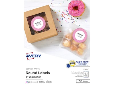 Avery Sure Feed Laser/Inkjet Round Labels, 3" Dia, Glossy White, 60 Labels/Pack (22891)