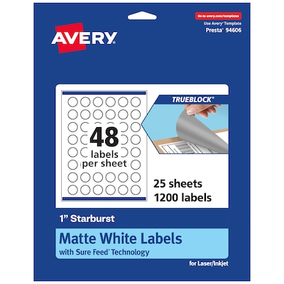 Easily update old information and create decorative labels, pricing labels, mailing seals, planner stickers, and more with Avery TrueBlock 1" Matte White Starburst Labels. Easily revise old labels with Avery TrueBlock technology. The proprietary TrueBlock feature completely covers up markings and printing so that none of your old data shows through. This also provides better contrast for your new print to stand out on a completely white background. The permanent adhesive makes sure that your labels stick and stay to a variety of surfaces without peeling, curling, or falling off. Avery starburst labels are carefully constructed with top features to provide the best results. Sure Feed technology reduces jams and smudges by creating a more reliable feed through your printer. The print-to-the-edge layout lets you print beautiful full-bleed designs that fill each blank sticker to the edge. Easily customize stickers, product labels, packaging labels, and more with your own art, symbols, and messaging by using the templates and designs on the Avery website. Avery Design and Print Online makes it a snap to create your own custom designs, mail merge information from spreadsheets automatically, and personalize existing templates to add your unique touch. Try out our intuitive, browser-based software today for free on the Avery site with no download required to achieve the best results for your next meeting, party, or event.
