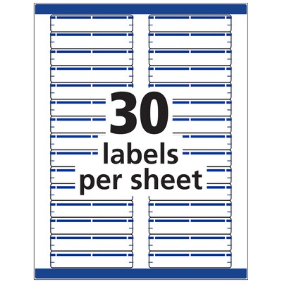 Make organizing your files, documents and binders a breeze with this colorful office solution that's here to stay. The bright blue strip on the top of these Avery file folder labels are perfect for color coding and quick file identification. With innovative TrueBlock(R) Technology, markings are completely covered, so your tab folder labels look neat and bright white every time. Lifting and curling are not a problem thanks to the permanent file folder labels self adhesive that guarantees your labels stick securely to smooth surfaces like paper, cardboard, plastic, wood, glass, metal and more. Write directly on tab folder labels or print at home in minutes using your laser or inkjet printer. Avoid printer misalignments and paper jams with our proprietary Sure Feed(R) technology that provides a more reliable feed through your printer. Get free templates and designs at avery.com/templates to customize your labels. This item comes with 50 sheets for a total of 1,500 white/blue 2/3" x 3-7/16" file folder labels.