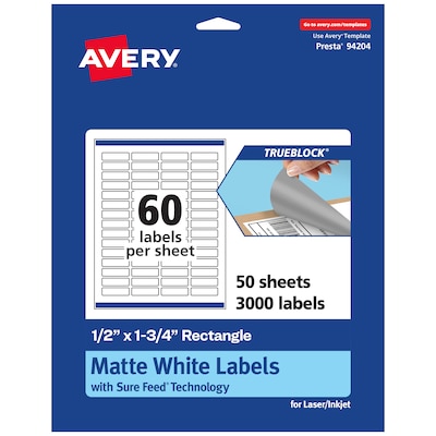 Avery TrueBlock Laser/Inkjet Rectangle Multipurpose Labels, 0.5" x 1.75", White, 3000/Box (94204)