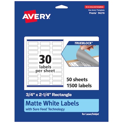 Avery TrueBlock Laser/Inkjet Rectangle Multipurpose Labels, 0.75" x 2.25", White, 1500/Box (94216)