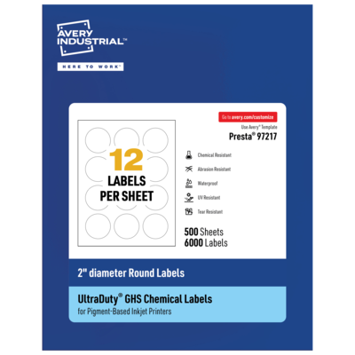 This package includes 500 regular paper-sized label sheets with 12 labels each for a total of 6000 round labels. Individual labels measure 2" diameter and work well as GHS labels for secondary containers and labeling other small containers. For example, NFPA and HMIS labels, spray bottle labels, inventory labels, and ID and barcode labels for jars. Strong enough for safety compliance, you can reliably use our printable chemical-resistant waterproof labels for tons of everyday uses, for example, ID labels for bottles, sanitizer labels, essential oil labels and outdoor waterproof garden labels for plants. Made with polyester, not paper, they stick permanently on a variety of surfaces including metal, plastic, painted surfaces, fiber, polycarbonate and glass. Designed for creating chemical safety labels that comply with OSHA standards and international standards for shipping chemicals overseas. Avery UltraDuty blank labels have been tested to last up to 90 days in the ocean without falling off, peeling, dissolving or fading (BS5609 Sec. 2) and are BS5609 Sec. 3 certified with approved printers. Print-to-the-Edge feature means that your designs and background color print all the way to the edge of the label. With no extra white border or outline, you have more printing space to feature your label designs. Create labels that won’t smear or smudge (even when submerged in water) with pigment-based inkjet printers such as: Epson® WorkForce Pro, HP® OfficeJet Pro, HP PageWide Pro and Canon® Maxify series printers. Visit Avery online for full BS5609-certified model and ink cartridge list. Ideal for a wide range of uses from labeling in wet facilities, laboratories and manufacturing plants to creating your own full size product labels or water bottle labels for kids. Great for products including beer bottle labels, wine bottle labels and more. Increase hygiene in facilities with hand sanitizer labels and stickers that don’t fall off or smudge from sanitizer drips.