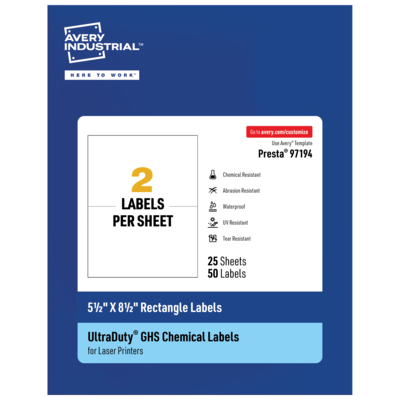 This package includes 25 regular paper-sized label sheets with 2 labels each for a total of 50 rectangle labels. Individual labels measure 5-1/2" X 8-1/2" and work well for GHS labels on primary chemical containers. For example, barrels, drums and large canisters. Strong enough for safety compliance, you can reliably use our printable chemical-resistant waterproof labels for tons of everyday uses such as creating large labels for tubs, buckets, beach equipment and outdoor waterproof garden labels for plants. These printable labels are made with polyester, not paper. They stick permanently on a variety of surfaces including metal, plastic, painted surfaces, fiber, polycarbonate and glass. Avery UltraDuty® GHS labels are designed for creating chemical safety labels that comply with OSHA standards and international standards for shipping chemicals overseas. Our waterproof blank labels have been tested to last up to 90 days in the ocean without falling off, peeling, dissolving or fading (BS5609 Sec. 2) and are BS5609 Sec. 3 certified with approved printers. Print using standard laser printers to create waterproof labels that won’t smear or smudge, even when submerged in water. Examples of laser printers include: OKI C711 series and OKI C900 series printers. Visit Avery online for full BS5609-certified model and ink cartridge list. Create durable, waterproof outer packaging labels that match the branding on your beer bottle labels, wine bottle labels and labels for jars and more. Increase hygiene in facilities with primary container hand sanitizer labels and stickers that don’t fall off or smudge from sanitizer drips.
