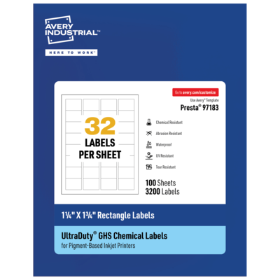 This package includes 100 regular paper-sized label sheets with 32 labels each for a total of 3200 rectangle labels. Individual labels measure 1-1/4" X 1-3/4" and work well for partial GHS labels as well as small containers, for example, ID and barcode labels for jars and bottles. Strong enough for safety compliance, you can reliably use our printable chemical-resistant, waterproof labels for tons of everyday uses, for example, name labels for bottles, sanitizer labels, essential oil labels and outdoor waterproof garden labels for plants. These printable labels are made with polyester, not paper. They stick permanently on a variety of surfaces including metal, plastic, painted surfaces, fiber, polycarbonate and glass. Avery UltraDuty® GHS labels are designed for creating chemical safety labels that comply with OSHA standards and international standards for shipping chemicals overseas. Our waterproof blank labels have been tested to last up to 90 days in the ocean without falling off, peeling, dissolving or fading (BS5609 Sec. 2). Print using standard pigment inkjet printers to create waterproof labels that won’t smear or smudge, even when submerged in water. Examples of pigment-based inkjet printers include: Epson® WorkForce Pro, HP® OfficeJet Pro, HP PageWide Pro and Canon® Maxify series printers. Ideal for a wide range of uses from ID labeling in wet facilities, laboratories and manufacturing plants to creating your own product labels, freezer labels or water bottle labels for kids. Increase hygiene in facilities with hand sanitizer labels and stickers that don’t fall off or smudge from sanitizer drips. Perfect for creating professional-looking labels for products that may get wet or go in the freezer, for example barcodes on beer bottle labels, wine bottle labels, labels for jars and more.