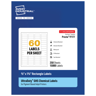 This package includes 250 regular paper-sized label sheets with 60 labels each for a total of 15000 rectangle labels. Individual labels measure 2/3" x 1-3/4" and work well for partial GHS labels as well as small containers, for example, ID and barcode labels for jars and bottles. Strong enough for safety compliance, you can reliably use our printable chemical-resistant, waterproof labels for tons of everyday uses, for example, name labels for bottles, sanitizer labels, essential oil labels and outdoor waterproof garden labels for plants. These printable labels are made with polyester, not paper. They stick permanently on a variety of surfaces including metal, plastic, painted surfaces, fiber, polycarbonate and glass. Avery UltraDuty® GHS labels are designed for creating chemical safety labels that comply with OSHA standards and international standards for shipping chemicals overseas. Our waterproof blank labels have been tested to last up to 90 days in the ocean without falling off, peeling, dissolving or fading (BS5609 Sec. 2). Print using standard pigment inkjet printers to create waterproof labels that won’t smear or smudge, even when submerged in water. Examples of pigment-based inkjet printers include: Epson® WorkForce Pro, HP® OfficeJet Pro, HP PageWide Pro and Canon® Maxify series printers. Ideal for a wide range of uses from ID labeling in wet facilities, laboratories and manufacturing plants to creating your own product labels, freezer labels or water bottle labels for kids. Increase hygiene in facilities with hand sanitizer labels and stickers that don’t fall off or smudge from sanitizer drips. Perfect for creating professional-looking labels for products that may get wet or go in the freezer, for example barcodes on beer bottle labels, wine bottle labels, labels for jars and more.