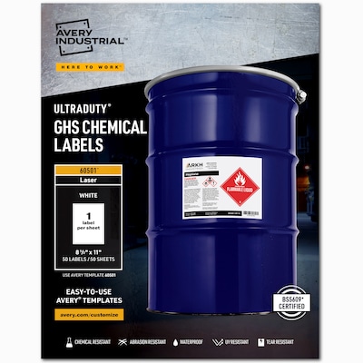 Get your organization's chemical labeling in compliance with the Globally Harmonized system (GHS). Avery(R) UltraDuty(R) GHS chemical labels are specifically designed to withstand chemicals, abrasion, sun, water and extreme temperatures. They resist tearing and scuffing, and stand up to frequent use. With high-performance adhesive, the durable labels pass the BS5609 Protocol for 90-day seawater immersion. Ideal for labeling for drums, pails and totes. Easily customize and Print your required labels on demand using free Avery(R) design & Print online. Take advantage of our ready-to-use free templates, or design your GHS labels step-by-step with the Avery(R) GHS Wizard(R). Labels can be printed using standard sheet-fed laser printers. Customize labels with your company logo, lot numbers, barcodes or other information, and update as needed.