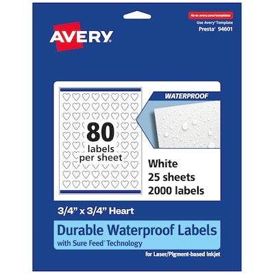 Avery Waterproof Heart Shaped Laser/Inkjet Multipurpose Labels, 0.75" x 0.75", White, 2000/Pack (94601)