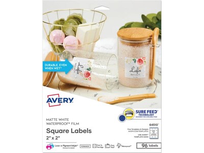 Avery Waterproof Laser/Pigment-Inkjet Square Labels, 2" x 2", Glossy White, 96 Labels/Pack (64510)