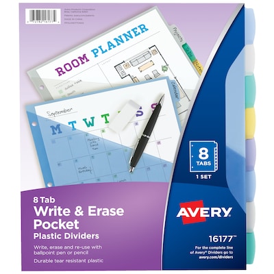 Write, erase and reuse these Avery 8-Tab Write & Erase Pocket Dividers to your heart's content. The wide design works perfectly with sheet protectors so that you can still view your tabs at a glance. Each 3 ring binder divider is made of durable, tear-resistant PVC-free plastic designed to hold up to frequent referencing. Write directly on the multicolor divider tabs with a ballpoint pen or pencil, and erase when you're ready to repurpose your page divider for the next project. The front pocket in each plastic divider is perfect for storing your loose, unpunched or smaller sized sheets, photos and documents. Each divider in this 8-tab set features a fun pastel color that is sure to stand out when you open your binder, and is perfect for color coding and quick identification. Tabbed dividers are 3-hole punched and ready for immediate use in standard 3 ring binders. This set of 8 write-on binder dividers is great for homework organization, personal finance planning, recipe binder dividers, as a coupon organizer, or anything else that needs sorting.