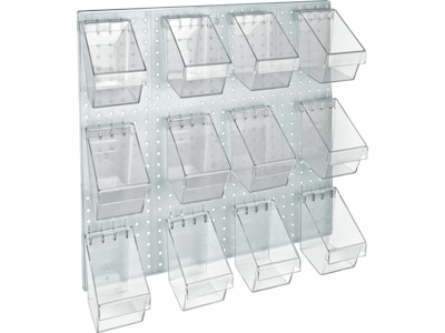 The Azar 12-bucket pegwall accessory organizer set is perfect for organizing tools, screws, hardware, toys, Lego, nerf accessories, arts and crafts supplies. The clear frosted pegboard is made of high-impact styrene for strength and durability. The kit includes 12 buckets with hardware to hang the buckets, and screws for hanging the pegboard on a wall. The open slope design of the buckets makes it easy to see what's inside and allows for easy accessibility to the items. The possibilities are endless with this pegboard accessory set: use in your home, craft room, play room, basement, dorm room, teen room, storage room, kitchen, garage, shed, workshop, office, or any retail environment. Simply mount the pegboard panel to any flat surface, arrange the buckets to your preference, and you now have an organizer wall kit. Add your own pegboard accessories such as hooks, trays and bowls, or check out the full line of Azar peggable accessories to customize your pegboard display. This accessory organizer kit is the perfect solution to help you declutter and get organized.