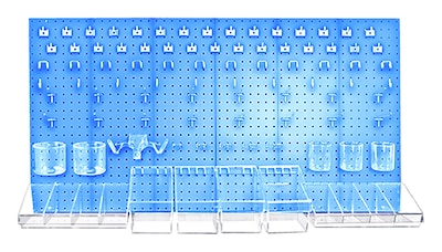 Pegboard 24 x 48-inch Blue Organizer Kit contains 2 pegboard wall panels 24x24,, screws, hooks, cups and bins that helps in organizing your supplies efficiently. It is suitable for use in dorm rooms, garages and craft rooms.