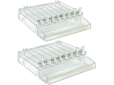 The Azar divider tray with attached tester tray is a game-changer for the retail industry. The eight-compartment divider insert creates a eight-slot divider tray system: simply snap in the molded insert into the tray. Add the included pusher tracks to keep your product pushed up front and always clearly visible. The tray includes dividers and pushers to make up to eight rows and is designed with an interlocking system to connect additional trays, giving the ability to create a long tray shelf. Features an attached tester tray on the front (not removable) that measures 12"W x 3"D and allows customers to see and feel the product before purchase. Also includes two U-hooks that can hang onto any pegboard and most slatwall, giving plenty of flexibility of how and where the tray can be used. The cosmetic tray sits at a 90-degree angle from the wall, and it can sit on a counter as well. Also comes with a graphic C-channel to adhere to the front for displaying brand name, color swatches, or product titles. The Azar cosmetic tray is the right choice for merchandising nail polishes, lip gloss, mascara, essential oil droppers, hand sanitizers, boxed products, and more.