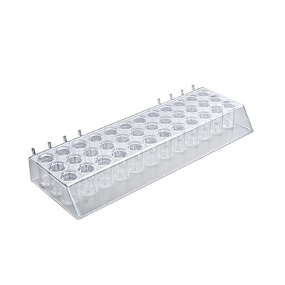 36-slot Mascara & cosmetic tray for pegboard / slat wall made of clear acrylic measures 1.5" x 4" x 13". Tray comes with round slots and 2 hooks for easy mounting.