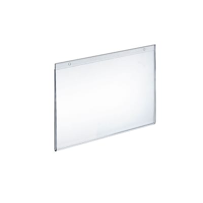 The Azar Displays Horizontal Acrylic Wall Mounted Sign Holder measures 9" x 12" and features pre-cut holes for hanging signs conveniently on walls and doors of your store.