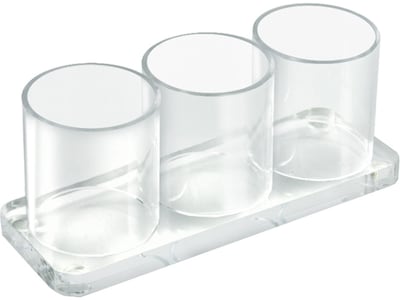 The Azar Deluxe three-cup display is perfect for arranging a variety of products such as brushes, cosmetic pencils, beauty products, office supplies, and small hardware in a neat and organized fashion. The clear material of the cups allows for easy viewing of the items inside, making them accessible to everyone. The cups are made of acrylic sitting on an acrylic block with rubber feet to keep the display from sliding on the counter or shelf. The deluxe design of this cup display enhances the look of any product placed in it and is a great addition to any retail environment or for use in your office or home.
