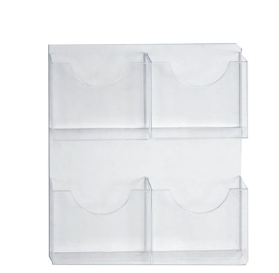 Four Pocket Magazine/Letter Holder mount holders with clear acrylic backing. Add hardware for grid wall, pegboard, slat wall, or glass.