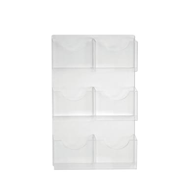 Six-pocket wall mount brochure holders with clear acrylic backing. Add hardware for gridwall, pegboard, slatwall, or glass.