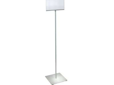 The Azar pedestal two-sided sign holder stand on a square metal base is perfect to display graphics, advertisements, promotions, and social distancing messages in stores, lobbies, hospitals, medical facilities, schools, offices, cafes, or anywhere a sign is needed. With a small footprint, the holder allows you to get your message or promotional information right in front of your target audience. The unit comes standard with a double-sided acrylic frame, metal pole, and sturdy metal base with rubber bumpers on the bottom. Featuring an easy-to-assemble construction and top-loading design, this freestanding floor stand is an affordable and simple solution to your signage needs.